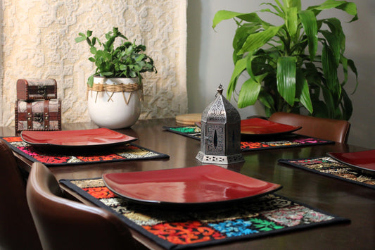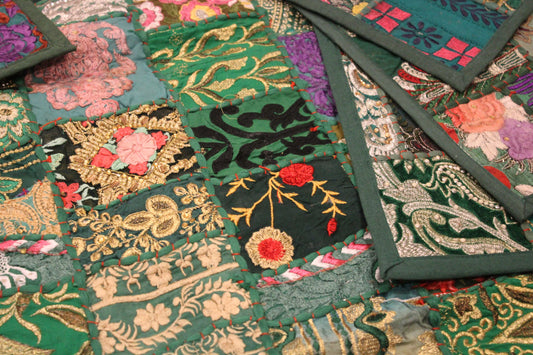 They are adorned with intricate designs made from patchworks of saree and suit fabrics. The traditional motifs are carefully embroidered from high-quality materials, adding a touch of artistic elegance to your dining table. Each placemat is a masterpiece of patterns matched with a diverse color palette.
