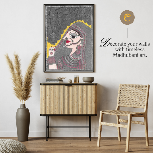 Madhubani paintings are known for their intricate designs and vibrant colors, they are created using natural pigments and dyes, and the designs are typically drawn with a bamboo stick or a brush. Madhubani art is traditionally created on handmade paper, cloth, or even walls, and are characterized by their bold outlines and flat, two-dimensional quality.